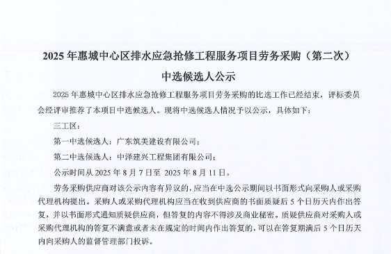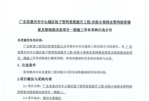 廣東省惠州市中心城區(qū)地下管網(wǎng)系統(tǒng)提升工程-內(nèi)街小巷排水管網(wǎng)病害修復(fù)及錯(cuò)混接改造項(xiàng)目一期施工勞務(wù)采購比選公告……